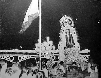 Sevilla 9 de Julio 2001 Como comentabamos en el artículo dedicado a Ntra Sra del Carmen de Santa Ana ha sido de las pocas imágenes que ha procesionado por nuestro rio, recordando la tradición indiscutiblemente marinera del barrio de Triana .- La interesante imagen que aqui vemos prueba este paseo fluvial en un barco donde se la imagen de la Virgen del Carmen de Santa Ana en el paso situado en la popa del barco. rodeada de fieles y devotos , donde igualmente se puede observar la bandera del barco y al fondo una curiosa instantanea del Puente de Triana iluminado con motivo de la Velá de Santa Ana . Todo ello ocurria en 1961 .- Como antecedentes históricos de presencia de la Virgen del Carmen en el rio Guadalquivir, tenemos el caso de la Virgen del Carmen del Convento del Santo Angel , ( no confundir con Ntra Sra del Carmen de la Iglesia del Santo Angel) una bella imagen pequeña que en 1948 presidió desde el centro del Puente de Triana el VII Centenario de la Marina de Castilla, en esta ocasión los asistentes a la mismas miembros de la Marina , lo hicieron en barcos desde el rio .- Y como proyecto de futuro es la es la Hermandad de Ntra Sra del Carmen de Calatrava quien tiene el proyecto de realizar una procesión fluvial desde hace años, sin que el mismo haya acabado de cuajar o de materializarse .- Seria hermoso recuperar esta perdida tradición