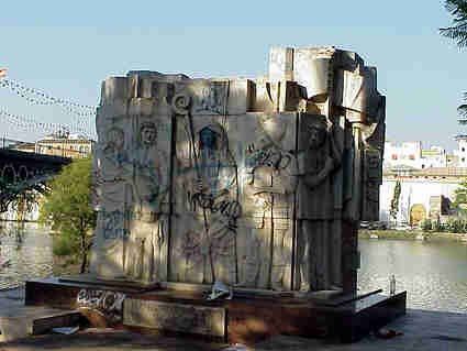 Sevilla que es muy agradecida con sus hijos ilustres ( recientemente le han dedicado un azulejo a la Pantoja ) Bartolome de las Casas cuenta en nuestra ciudad con varios monumentos . En las dos fotos anteriores tras las pintadas, tras las meadas, tras los critales de la botellona, casi no se puede ver este monumneto dedicado al defensor de los indios , ubicado en la orilla del Guadalquivir a los pies del antiguo Barranco y frente al Puente de Triana .y no se extrañe usted de no haberlo visto antes , pues no está precisamnte a mano La obra la componen unos relieves sobre bloques de piedra donde se puede apreciar al obispo de Chiapas , en el centro ( el que esta con la cara con una pintada en azul )y a ambos lados soldados españoles y al otro lado los indios .- En la siguiente foto se puede apreciar el reverso del monumento y su "perfecto estado" de conservación, donde incluso faltan trozos del mismo y es tomado por un tapia para realizar todo tipo de pintadas .- Este desdichado y maltratado monumento es obra de Emilio Garica Ortiz y fue inaugurado en 1984 coincidiendo con el quinto aniversario del nacimiento de fray Bartolome. Y que digo yo que aprovechando lo de la beatificación podrian limpiarlo o aun mejor colocarlo a diez metros del suelo a salvo de los vandalos y alanos de la movida ribereña .-