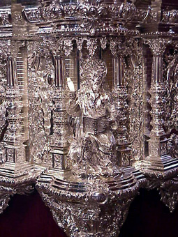 Este ha sido el segundo año consecutivo sin Curro Romero en el cartel de la Plaza de Toros de Sevilla ( Maestranza ) y en especial en el Domingo de Resurección . No hay la menor duda de que el patrimonio inmaterial de Sevilla se ha resentido, pues al dia de la fecha no existe una figura del toreo en España que tenga el tirón devocional de Curro Romero, 40 años faraónicos, (la biografia de Curro en datos númericos y objetivos) .- Tambien es cierto que ha tendio la gran suerte de tener un reconocimiento en vida a toda su inmesa vida dedica al arte de la tauromaquia Es Medalla de Oro de Andalucia, Medalla de Oro de Bellas Artes ( con absoluto merecimiento) y ademas pertenece al patrimonio histórico -artísitico viviente , tiene una calle en nuestra Feria y este año se inauguró una acertada escultura ( ver Monumento a Curro Romero), que desgraciadamente ha sido victima de un par de atentados por algún enemigo de la fiesta nacional , afortunadamente sin mayores consecuencias .- Pero lo que existe en los vericuetos de nuestra Sevilla es un monumento intimista al sinónimo , hoy desgraciadamente perdido de Curro = Domingo de Resurección , y que es fruito de la siempre genialidad de los orfebres hermanos Delgado Lopez en los impresionantes respiraderos del pasopalio de Ntra Sra de la Aurora de la Hermandad del Resucitado .- Si se situa frente al pasopalio en el evangelsita de la derecha en las hojas abiertas de los "evangelios en blanco" aparece en una hoja el nombre de CURRO y en la otra hoja ROMERO y bajo el ANGEL D.L., uno de los hermanos Delgado posiblemente curritsta y que tuvo sin duda la genialidad como en toda la obra de estos orfebres de dejar inmortalizado en plata al Faraón de Cama con el Domingo de Resurección dia en que por la mañana procesiona esta hermandad y que por la tarde toreaba Don Franciso Romero López .- Curro no es precisamente uno de estos toreros muy vinculados a hermandades y cofradias de Sevilla . Curiosamnete este año pasó de hermano honorario a efectivo ( es decir pagando ) de la Hermandad de los Gitanos y donó un traje de luces a la Hermandad de los Javierres , con el cual le han hecho una saya a Maria Santisima de Gracia y Amparo ,lamentablemente los priostes colocaron un callejon de entrecandeleros tan estrecho que sencillamnte no se podia ver .- Como siempre