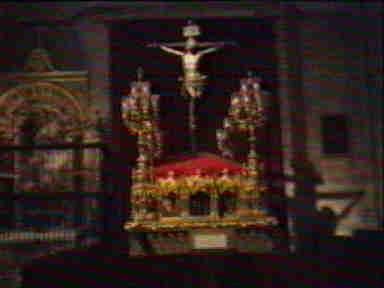El continente como decía fue nuesta parque Temática Catedral de Sevilla y con un contenido de mas de trescientas piezas. El contienente esta quizás mas deteriorado con unas obras eternas en las columnas del trascoro y el contenido mas o menos es el mismo .- Dentro de esta exposición en las naves catedralicias durante los meses que duró la muestra estuvieron presente el Cristo de la Misericordias en su paso gótico y Ntra Sra de la Candelaria, en su característico pasopalio de azul y plata , como vemos en las imagenes .- La muestra estaba dividida en varias secciones y dentro de La Iglesia el Siglo de las Luces, ambos pasos formaron parte de la muestra , como representación de nuestra Semana Santa dentro de la Catedral .- En unas cartulinas se aportaban alguna informacion como la altura del Cristo 1.75m y de la parihuela 2.06 X 3.77 X 1,50. El Cristo es obra atribuida a Pedro Roldan y la canastilla del paso de Antonio Martin con dorados de Luis Sanchez . En cuanto al pasopalio la imagen mide 1,61m y las dimensiones del paso son 2,10 X 3,34 X 1,48 La Dolorosa es obra de Manuel Galiano Delgado y tanto las bambalinas como el palio son obra del genial Juan Manuel Rodriguez Ojeda .- Como vemos ademas de La Pasion dentro de Los Esplendores de Sevilla (Expo 92 .-en la Iglesia del Salvador, se sumaron estos dos pasos a la muesta universal .- VOLVER A PAGINA PRINCIPAL