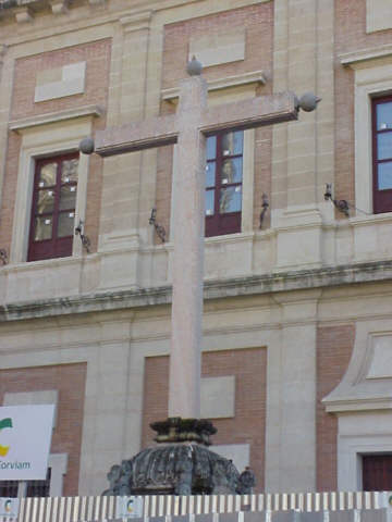 Si en mi anterior entrega la Cruz del Garfio, que decia que era una cruz con una finalidad mas mercantil que piadosa, pues la que hoy aqui les traigo es cuarto y mitad de lo mismo .- Aqui ven o mejor dicho lo que al dia de hoy se puede ver por mor de las interminables obras que se estan realizando en el Archivo de Indias . Se encuentra situada en la fachada de dicho edificio que da a la calle Fray Ceferino Gonzalez, aunque ese no fue su enclave original; antes se encontraba como se puede apreciar en grabados antiguos en la fachada principal de la casa de la Lonja.- Esta magnifica cruz de jaspe , sobre una peana de piedra labrada ( que en la actualidad no se puede ver ) y esta datada en 1609 . Pues bien la finalidad de esta cruz no era otra que prestaran juramento ante ella de sus negocios los corredores y tratantes de la Casa de la Lonja sevillana, es decir ,una especie de palabrita del Niños Jesus , de que no te voy a engañar . Da como miedo pensar cunatos perjurios se realizaron ante ella .- Ante ella cual calle Sierpes , cuando el tiempo