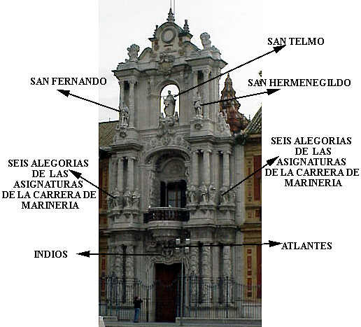 | Este año la Portada de la Feria de (Mayo de Madrid ) Sevilla 2004 se ha inspirado en uno de los edificios más representativos del Barroco sevillano, conocido como el palacio de San Telmo , inicialmente vinculado desde su construcción que comenzó el 10 de Marzo de 1682, a la Navegación de Indias (Universidad de Mareantes). Posteriormente convertido en Colegio de Marina hasta su adquisición por los Duques de Montpensier en el que fijan su residencia. En 1893 la infanta Doña Maria Luisa cede a la ciudad de Sevilla parte de los jardines del Palacio ( de ahi el nombre de parque de Maria Luisa , con absoluta propiedad pues era suyos ) y que al morir en 1897 lego el Palacio a la archidiocesis de Sevilla que lo convirtio en Seminario.En 1989 es cedido a la Junta de Andalcuia como sede de la Presindencia .- Uno al ver la portada de la Feria y el Palacio, hay que hacer un auténtico acto de fe, aunque logicamente teniendo presente que es una inspiracion en particular de la portentosa fachada que es en la que no vamos a centrar .- Lo primero que se nos antoja es que si estuviera dentro de una Iglesia podria pasar por un retablo religioso , pues es como decia al principio una manifestacion d ela arquitectura del barroco en estado puro .Sus autores fueron Leonardo de Figueroa que en 1725 era Maestro Mayor de la ciudad , su hijo Matias y Antonio Matias de Figueroa nieto del primero e hijo de este . Las obras fueron desde 1775 a 1796 y costo 50.000 pesos de la época .- Haciendo una descripcion de arriba abajo tenemos en la parte superior un circulo donde en su dia hubo un reloj que fuera destruido por un rayo . Mas abajo la figura de San Telmo patron de los navengantes portando en una mano una carta de navegacion y un barco . Esta flamqueado por los patronos de la ciudad San Fernando y San Hermenegildo ( yo lo siento pero el Señor San Julian no aparece por ningun lado ) ataviados con su purpura real .- Mas abajo hay doce figuras de mujeres , situandose seis a cada lado ( hubiera sido un detalle representarlas en la portada de Feria vestidas de faralaes, con el catavino y el movil al cuello ) representando a las asignaturas que se estudiaban de las artes de la mar cuando era Universidad de Mareantes .- Mas abajo en la base del balcon figuras de atlantes, algunos con forma de indios que representa la carrera por las Indias Occidentales , pues alli se formaron los pilotos, capitanes y cartografos que participaron en la conquista del Nuevo Mundo, toda una epopeya .- Esta fachada se encuentra en la Avenida de Roma por la que los sevillanos pasan cienes y cienes de veces al dia con mucha prisa pues todos van en coche y no estan para averiguar ni donde esta San Telmo ,ni las representacion alegoricas de las asignaturas nauticas . En la otra fachada del palacio en la calle Palos de la Frontera a la espalda del Hotel Alfonso XIII estan las esculturas de los Doce Sevillanos Ilustres que esculpiera el malogrado Antonio Susillo .- Como dice el maestro Antonio Burgos en Sevilla