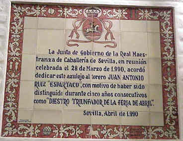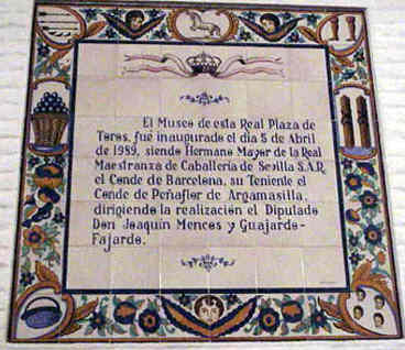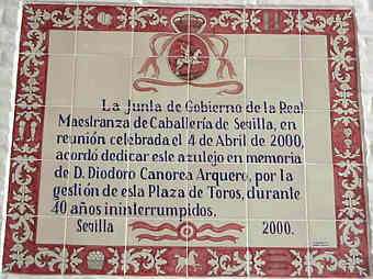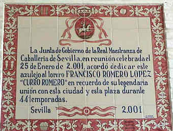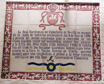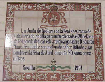 JULIO DOMINGUEZ ARJONA Sevilla 22 de Enero de 2003 Por aquello de que a primeros de Febrero comienza la Feria Mundial del Toro , que el Guadalquivir pasa bajo el puente de Triana , que sutedes saben que un servidor es el tonto del azulejo, y que un servidor sabe que sutedes van con mucha prisa hasta los toros con el movil en una mano y el vaso de güisqui en la otra y no se fijan en esta cosas ; hoy les traigo aqui una parte muy importante de la historia de la Plaza de Toros de Sevilla ( Maestranza ) escrita en azulejos ( como ven ustedes no todo van a ser hermanos mayores azulejeros ) .- Digamos que esta coleccion de azulejos, con la excepcion de la inauguración del Museo , son un publico in perpetua memoria o a toda una vida dedicada dedicada al mundo de los toros ; Curro Romero 44 temporadas ; Diodoro Canorea 40 emporadas de gestion de la Maestranza o Eduardo Miura cuya ganaderia se ha lidiado durante cincuenta años consecutivos .- Tambien estos azulejos son un premio al triunfo sobre el ruedo : el rejonaedor Javier Buendia triunfador siete años consecutivos; Manolo Vazquez salir con cincuenta años por la Puerta del Principe y treinta de alternativa ;la ganadera Doña Maria Luisa Dominguez y Perez de Vargas ganadora durante cinco años consecutivos el premio a la mejor corrida de toros ; Juan Antonio Ruiz "Espartaco" triunfado durante cinco temporadas consecutivas .- Como ven una especie de Gines ( Aljarafe ) Record , de proezas , de constancia , de continuidad dentro de la tauromaquia .- Como decia al principio esto es una parte importante del siglo pasado ( el siglo XX), pues la historia de la Maestranza de Sevilla es mas amplia y esta llena de anecdostas y curiosidades , algunas de ellas tristemente escritas como decia el titulo de Blasco Ibañez con Sangre y Arena .- Por eso la proxima vez que entre en la Plaza de
