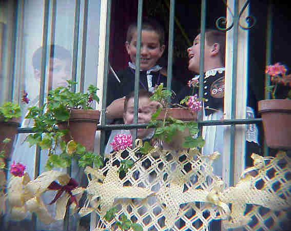 15 de Abril de 2002 Señores estos niños que ayer reian y bromeaban desde el balcon de la casa hermandad del Museo, ajenoS al tiempo, ajens Sa la lluvia, con la felciidad que da una corta edad y una mirada cristalina de todo su entorno ;son nuestra garantias de futuro y de la eternidad de nuestra Semana Santa ; esto niños y todos los niños y niñas de nuestras hermandades .- Autentico parvulario , con dos kilos de fijador en la cabeza , cuyas madres han esculpido un peinado perfecto, con su canasto lleno de caramelos y de ilusion, todos en tropel, como un jubiloso ejercito infantil comandados por un nazareno que voluntarioso y paciente como un enlutado maestro con capirote y esparto recibe el nombre de pavero, que va a su menesteroso cuidado .- Hermanos mayores y junta amantes de cambiar hasta los azulejos de los cuartos debaño de la casa hermandad; estos son nuestros herederos, ellos deberian de heredar las mismas Semana Santa que nostros heredamos de nuestros padres y ellos de nuestros abuelos, esa es nuestra responsabilidad y nuestro deber, los mismo que para ellos sera transmitirsela a sus descendientes .- Bendito sena