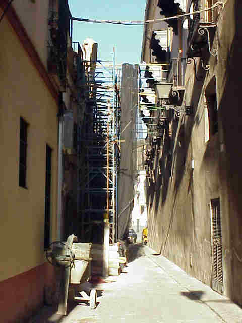 Esos andamios lleva tanto tiempo alli, sujetando una fachada hueca, rellena de jaramagos ; que el año proximo se los llevaran a MUNARCO; para presidir la cúpula y como muestra y representacion de los diversos andamios , que han criado raices, en el recorrido de varias de nuestras hermandades por el Casco Historico , mal llamado Centro Si Rodriguez Buzon viviera en la Sevilla contemporanea habria tenido que escribir algo parecido a esto Una sombra el rostro le nubla