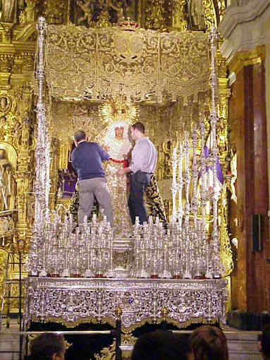En una pequeña estadistica que he realizado entre vestidores , priostes y sus ayudantes, al preguntarle que han sentido al portar entre sus manos aquel Cristo u aquella Virgen,por unos segundos o al haber permanecido durante varios minutos a escaso centimetros de Ellos, curiosamente casi todos han respondido dos cosas : Una inmesa responsabilidad y una tremenda emocion .Responsabilidad de tener entre sus manos y brazos, devociones de no ya de siglos, sino de varios miles de corazones y emoción donde casi se le puede hablar al Hijo de Dios y a su Madre, musitando una oracion, dando las gracias por una peticion alcanzada o rogandole ayuda en uno de los tantos mal tragos que la vida nos reserva, parece como si por un instante se gozara de toda su divina atencion .- Despues, hay que fijarlo y asegurarlo todo hasta la obcesion , todo debe quedar perfectamente sujeto pero sin parecerlo , en eso radica el milagro, una tramoya oculta de tornillos, alfileres y sobre todo cachisto de alambres y bridas, crearan el milagro de como en una levantá, donde efectivamente parece que todo vaya a despegar al Cielo, a su regreso a la Tierra, todo siga en su sitio .- Solo unos pocos tendran el privilegio de realizar