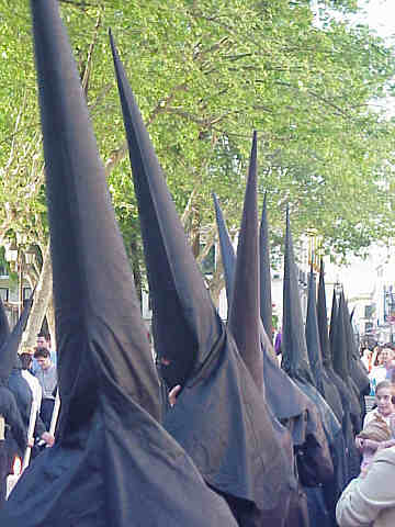7 de Abril de 2004 Nazarenos negros, nazarenos blancos , un inmeso rosario que inundara todas las calles de Sevilla, cuyas cuentas seran interrumpidas por el Misterio de los pasos; misterios gozosos de olivos, palacios, plumas de romanos al viento y reviras o remontadas de cuestas interminables .- Nazarenos de cola , nazarenos de capa, en un intermitente gota a gota como la cera de sus cirios blancos, negros, verdes , azules y de mil colores que imaginarse pudiera , hasta capaz de crear uno color tiniebla , que como la migitas del pan del cuento infantil quisiera dejar fijado el recorrido del regreso a casa de vuelta .- Nazarenos que descalzos notaran el frio de los adoquines, mientras rezan el rosario entre sus manos, nazarenos de manoletinas toreras y hebillas , nazarenos del infantil Dame un caramelo .- Nazarenos del ajustado esparto , nazarenos de cingulo , nazarenos que cruzaran las estrechas calles en sombra del centro, nazarenos que recorreran parques, plazas y puentes iluminadas por las primeras horas de la tarde bajo un Sol de justicia , que les azota .- Nazarenos solitarios de hermandades de negro ,