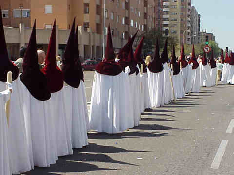 Habra uno de muchos instantes de infinita soledad en la multitud; en el que se sentiran como desposeidos del cuerpo y cual almas en pena , paseran por Sevilla, invisible a los suyos , veran pero no seran vistos y por ese camino mas corto se encontraran con ellos mismos.- Vestirse de nazareno es uno de los mas portentoso ejercicio espiritual de interiorismo, un viaje a nuestra propia alma . Es mentira eso de los nazarenos de silencio; cuando se va ahi ,se habla con Dios y sobre todo con uno mismo, quizas eso da mas miedo . Se hacen balance de los bueno y malo ,y en la mayoria de las veces no nos cuadran los numeros de nuestra propia vida , pues a nosotros mismos no nos podemos engañar, ni falsear , nuestras propias cuentas de nuestra vida .- Es una oportunidad unica de sentir lo que sentiria un fantasma , vagar por tu barrio, por tu ciudad, ver familiares, amigos conocidos, en un purgatorio de unas horas , donde mas de uno al quitarse el antifaz ha salido con los ojos enrojecidos de sus propias lagrimas .por su propia pena .- Cuantos pensamientos a la luz de un cirio mientras jugamos con la cera , cuantos pensamientos al ver aquel amigo que hacia tiempo que no veiamos y no podemos llamar su atencion para saludar; al ver aquella novia que se nos fue y hoy rodean otros brazos , al pasar por la calle donde vivimos, por el colegio donde estudiamos , en suma al repasar toda nuestra vida desde la Cruz de Guia , hasta el ultimo penitente .- Quien no experimente todo esto es que no sabe
