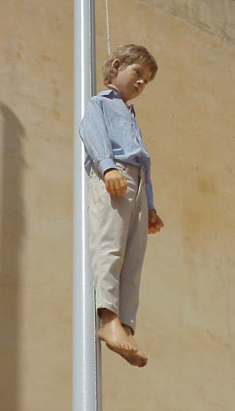 5 de Octubre de 2004 Una vez le preguntaron a un gitano que era el arte , a lo que este respondio sin pestañear : "Compare; helarte es morirte de frio" Pues si van a esta macro tomadura de pelo llamada BIACS,Bienal de Arte Contemporáneo de Sevilla no se moriran de frio, sino se quedaran helado cuando vean esto( de lo demas que hay alli les aseguro que compensa pagar la entrada porque se descojonaran de risa ) comprobaran, dos cosas; que a cualquier cosa llaman obra de arte y que cualquiera puede exponer en una exposición .- El señor que ha tenido esta idea de colgar a un niño (escultura se entiende ) de una soga , en poco se diferencia del que colocó una polla al lado de la Esperanza de Triana o los que se le ocurrieron Matanza Cofrade I y II, es decir buscar el escandalo facil, violentado los sentimientos cristianos y cofradieros estos ultimos, y violentado todos los sentimientos violentables, de los que vean en vivo y en directo ,lo que ven en la fotografia . Asi de sencillo, buscar un protagonismo rapido ....y poco mas ,Todo esto, en poco se diferencia del circo de prensa de la entre pierna, que vemos en la television donde unos señores y señoritas, desnudas dignidades propias y ajenas ,para alcanzar una fama via express.- Vivimos en una etapa de nuestra instituciones estan absolutamente acomplejada, pues temen que se las tache de lo que sea y la tolerancia radical, es tan mala como la intolerancia radical. Solo eso podria explicar que en un pais supuestamente civilizado se le llame matrimonio a un enlace de mariquitas o tortilleras y que ademas se les habra las puertas a adoptar niños . - La señora encargada de esta chuflesca exposicion , ha salido a la palestra diciendo que la realidad es peor, y creo que en el Horno de San Buenaventura y en Polvillo el pan a subido mas que la Bolsa de Tokio ; claro buena mujer que la realidad supera culaquier ficción de barbarie humana como la que aqui vemos ,pero ello no lo justifica .- Nuestra sociedad esta perdida en la doble moral ( eso es muy cofradiero y sevillano, el poder de escandalizacion es selectivo ). Imaginese que en vez de colgar a un niño, te cuelgan a una mujer maltratada, o te cuelgan a un negro o un moro, entonces que Dios , nos coja confesados.- Quizas el autor ( es un decir ) de esta obra ( es otro decir) supongo que no habra considerado los padres de los niños que murieron en Atocha en el 11-M, supongo que tampoco habra pensado en los niños que sufren de verdad estos malos tratos en sus carnes , que asistan a esta supuesta muestra ; posiblemente se vean reflejado en este niño y hasta que tengan pensadillas donde ellos ocupen su lugar .- Alguien dijo una vez, que si le ponian delante un bote de cristal transparente con un liquido blanco en su interior y fuera un letrero que ponia "leche", no hay duda que estaba ante una botella de leche; pues aqui lo mismo no estamos ante arte transgresor, estamos simplemente ante una transgresión , que va mas alla del mal gusto ,pues por lo visto la culpa son los ojos con los que se miran .Para hacer estas cagadas , no se inventó la libertad de expresion artistica .- Para colmo este creador ( es un eufemismo ) no ha sido ni original ,pues en la pelicula "Enemigo a las puertas " de Jean-Jacques Annaud, donde se relata la vida Vassili Zaitsev, un francotirador sovietico que tuvo en jaque al ejercito aleman en Stalingrado , hay una escena donde su perseguirdor aleman ahorca a un niño traidor y confidente, usandolo de reclamo para capturarlo .- Desgradiamente hoy por hoy ,no hay en Sevilla quien tenga lo que hay que tener para coger una escalera , cortar la soga y quitar esta ofensa a los sentimientos ,empezando por los de los niños.Muy enferma debe andar nuestra sociedad, cuando a esto se le llama obra de arte .- Y otros te sacan nazarenos llorones modelo Capirote de la Alcaiceria a lo bestia