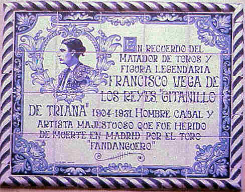 Nuestros pasos nos lleva al tambien barrio sevillano de Triana , en la calle pages del Corro 156 , una pared nos habla de otro centenario de un nacimiento, en este caso referido al mundo taurino en la persona , nada mas ni nada menso que de Francisco Vega de los Reyes , Gitanillo de Triana que nace en Sevilla el 23 de Septiembre de 1904. Tuvo una exitosa carrera taurina .- Curiosamente sobrevivió a un aparatoso