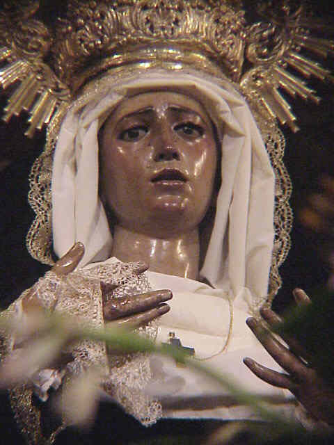 12 de Noviembre de 2004 Este domingo, será Domingo de Ramos.; porque en San Juan de la Palma, el Sol no morirá, en el palacio de Herodes, ante un desprecio combatido con el Silencio de Jesús, no, el Sol nacerá , en el Cielo y nuestros corazones , cuando Ella , salga a la puerta de su casa .- Este domingo , será Domingo de Ramos ,porque Ella, rosa tronchada de dolor silente , emprenderá un camino de alba, donde unas mujeres santas en vida , no serán rosas fresca que reponga su palio a su regreso , serán rocío de la mañana, de devociones , plegarias y rezos .- Este domingo, será Domingo de Ramos, porque una Dolorosa que de tanto dolor, se le quedo impreso en su rostro , que de tanto llorar , apenas ya le quedan lágrimas que derramar , bajo el palio de varales de palmeras de su barrio .- Este domingo, será Domingo de Ramos, porque Sevilla se encontrará a si misma , reflejándose en el espejo de su Doliente mirada , cuando pase por un Salvador donde se perdió su rampa para siempre ; muerto, hueco ,y yermo sin que su interior se encuentre ni Amor, ni Pasión, en unos muros que parecen pedir Socorro , ante la insensatez humana .- Este domingo , será Domingo de Ramos, porque descubriremos un lado oculto de su rostro , que siempre ha tapado un Hijo que ahí tenia a su Madre, una María Santísima que ahí tenia a su Hijo, para que la acompañara eternamente por la calle que lleva su nombre propio .- Este domingo, será Domingo de Ramos, sin estrenos, sin niños de zapatos de charol , ni palmas, sin ese pregón mas que grito , al ver el primer nazarenos blanco pero se dará la paradoja de un mas que elocuente silencio de un gentío, al contemplarla solo a Ella .- Este domingo , será Domingo de Ramos; porque por una horas en una ciudad desgraciada donde los nubarrones del mal gusto , de los despropósitos implantados por los que rigen nuestros municipales destinos, se disiparan por el brillo de la luz de su pasopalio de plata, para recordarnos que hubo un tiempo donde éramos la medida de la cosa y las cosas eran medidas en Sevilla.- Este domingo , será Domingo de Ramos, en una ciudad Muy Mariana y Muy Concepcionista, todos los sevillanos haremos de San Juan , para que no se sienta Sola, en una Sevilla real, frente a una acomplejada Sevilla oficial, que lo mismo le pone una vela a Dios para salir en la foto, que ponen una vela en una liturgia imposible de un mundo minoritario sin fe .- Este domingo, será Domingo de Ramos en