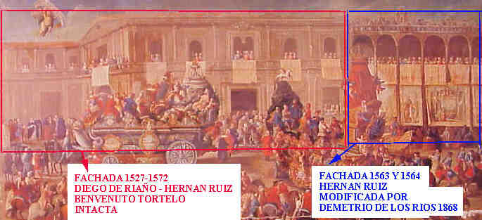 Este oleo de Domingo Martinez ( 1688-1749) Carro de entrega de los retrato de los Reyes al Ayuntamiento , que se puede ver el el Museo de Bellas Artes de Sevilla segunda pinacoteca de España , se puede ver como se veia la fachada en el siglo XVIII . Se ve la fachada de doble balconada de seis arcos realizada por Hernan Ruiz entre 1563-1564.-