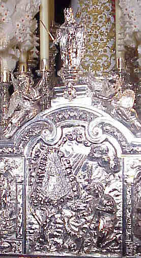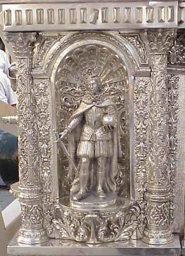 San Fernando esta en horas bajas, San Fernando es tan sevillano que como tal es malquerido por sus gobernantes y sus indolentes y adocenados paisanos, que no lo reivindican: Si San Fernando ayer al descubrir la urna de Laureano de Pina hubiera levantado la cabeza a buen seguro se habria puesto colorado aunque este momificado el pobre , como la mojama .- Sirva este modesto homenaje de las representaciones fernandinas argentas que hay tanto en nuestras hermandades de penitencia, glorias y rocieras .- En la solitaria imagen superior vemos el mas impresionante escudo de Sevilla , que sin duda hay en nuestra ciudad y que corresponde a esa plaza de España de plata ( copiray maestro Burgos) que es el paso del Señor de Pasion obra cumbre de la orfebreria cofradiera realizado por Cayetano Gonzalez .- En las dos fotos siguientes tenemos dos miniaturas de San Fernando el de la izquierda segun se mira en la delantera del paso de la Virgen de Valvanera con sede en la parroquia de San Benito, que como recordaran ( o desconocera ) existe la creencia que fue el primer lugar donde San Fernando celebró misa en la reconquistada Sevilla a los infieles, para que despues te quiten el dia de fiesta .- A la derecha segun se mira, vemos otra miniatura