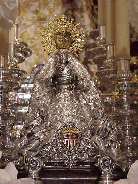 22 de Marzo de 2005 Ayer en mis solitarios y matutino capilleo semanasantero me acerque a contemplar el nuevo llamador del pasopalio de Ntra Sra de las Mercedes Coronada .- Se me acerco un hermano , un buen cofrade de los de verdad, de los que se lo cura todo el año y se hace cargo de las funciones de su puesto de junta y de todo lo que haga falta en pro de su hermandad sin mirar nunca el reloj. Gracias a personas como estas , se produce el milagro de sacar una cofradia a la calle todos los años .- Se me quedó mirando con el orgullo que enseña un estreno y me pregunto "Que,¿ te parece , bonito no ?.- Si dudar le replique , que me gustaba mucho y le comenté la proliferación de nuevos llamadores este año, al preguntarle que ademas del escudo de la corporacion, que representaba construi mi propia hermosa trampa .- Mi interlocutor dibujo una amplia sonrisa y me contesto " ¿No lo vez ? , en el se representa las tres Virtudes Teologales ".- -"Ah si , a la derecha la Fé con los ojos vendados y la cruz, a la izquierda la Caridad, pero ¿ donde esta la Esperanza ?", con mi respuesta , le deje en suerte la siguiente respuesta :- - "Julio, la Esperanza .......Macarena, siempre Macarena la tienes delante de los ojos" .- La genialidad de Fernando Aguado, su diseñador, ha sido diseñar un llamador con las tres Virtudes Teologales , y ha incluido en el mismo solo dos la Fe y la Caridad, pues la Esperanza esta representada en la bella minuatura que desde siempre ha llevado en la delantera el palio, de la Macarena, haciendo un todo con el llamador y la miniatura , un hermoso jeroglífico .-