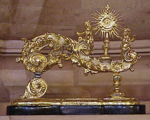 dos angeles rodean un cáliz con la Sagrada Forma .-
