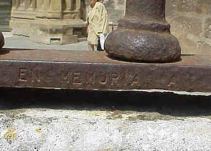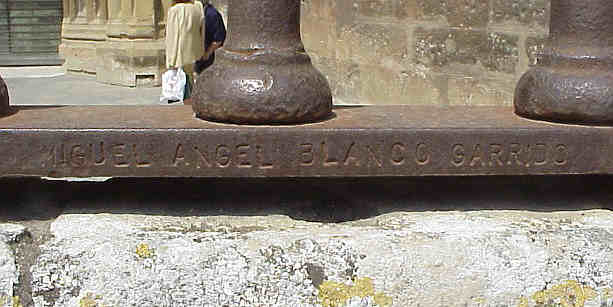 1 de Junio de 2005 Segun informa hoy el diario gratuito 20 Minutos VER NOTICIA ( las fuentes siempre hay que mencionarlas ) un joven casualmente ha descubierto esta inscripción en una de las rejas exteriores que rodean , la Capilla Real , en la Puerta de Campanillas ( que no tiene nada que ver con la amiga de Peter Pan ) "en memoria a Miguel Ángel Blanco Garrido asesinado por ETA y HB, por esos mamones, el 12-7-97" Las rejas fueron restauradas en la época , que ocurrio este tragico suceso , por la Escuela Taller Catedral de Sevilla y y alguien quizo dejar plasmado lo sucedido y lo que pensaba de ello .Olé lo que tenga en la entrepierna .- Curiosamente si uno recorre estas misma reja y la puerta siguiente , aparece practicamente un listado horizontal de nombres y apellidos de supongo personas que intervinieron en estas restauración .- Esto es como aquel que talló un astronauta en una de las puerta de la Catedral de Salamanca , conmemorando que el hombre llegó a la Luna .Segun dicho periodico los responsables de esta restauración han manifestado que piensa borrar esta incripción , por no autorizada, lo que seria un gravisimo error .- Hoy se habla de dialogar y/o/u negociar con "eta" ( siempre con minuscula ). Nuestra fragil y selectiva memoria historica olvida enormemente la cantidad de victimas de "eta", la cantidad de guardias civiles de pueblos andaluces que eran asesinados en la Vascongadas y eran enterrados de prisa y corriendo, pero no solo los mataba a ellos sino a sus esposas e incluso a sus hijos mientras ponian en peligro la independencia de las Vascongadas mientras dormian en sus casas-cuarteles.- Todos estos hombres, mujeres y niños, murieron sin manifestaciones en el norte , sin manos blancas, sin lutos , sin lazos negros . Pasaron años, ( he dicho años ) y un trágico dia los perros etarras nos pusieron a todos ,una pistola en la nunca, con un plazo fatal y en un bosque perdido de las Vascongadas al disparar cayó Don Miguel Angel Blanco Garrido; un vasco le pegaba un tiro a otro vasco y miren ustedes por donde esta sociedad vasca adormecida, esta sociedad silente, desperto y salio a la calle en sus propias provincias y ciudades vasca . Asi nacio el llamado espiritu de Ermua y el famoso grito del ! Basta Ya !. Algo habia cambiado en todo esto , tarde muy tarde, pero en algo habia cambiado y el coste habia sido terriblemente caro la vida de un hombre .- Quizas este homenaje grabado en hierro forjado , deberia de verlo nuestro querido ZP, deberia de recordar aquellas cienes y cienes de plazas de toda España , inundadas de oceanos humanos que guardaron infructuosamente aquella noche una vigilia de velas rogando por la salvacion de la vida de Miguel Angel, que esta banda de vulgares asesinos asalariados , lo ejecutaron fria y maquinalmente . - Quizas nuestro Gobierno en solo ocho años que lleva ahi esta inscripción desconocida por todos , sean para ellos unos mas que afortunado rabitos de pasas, para que lo que ocurrio despues, y que el impresionante movimiento social. que vino despues , sin precedentes en la historia de España sobre todo en las provincias españolas vascas, llena de españoles vascos, .- Enhorabuena a la persona que grabó esto, se quedo corto/a; enhorabuena al joven que lo ha descubierto ha sido como un mensajero del pasado y enhorabuena a 20 minutos por publicarlo en un momento clave de nuestra historia de relación con "eta" ,donde se estan escuchando tantas tonterias y sobre todo se esta olvidando a las vicitmas y a sus familiares de esta banda de criminales , pues solo son eso criminales Ya va siendo hora de llamar a las cosas por su nombre y faltaria reja en la Catedral de Sevilla para grabar todo lo que se pensó aquella noche y aquel tragico dia .- No lo borren , no nos traicionemos a nosotros mismos, ni a Miguel Angel Blanco, ni a Alberto , ni a Asen, ni a Muñoz Cariñano , ni a tantos hombres , mujeres y niños, ( por Dios tantos niños ) cuya sangre les salpicará y maldecirá eternamente a sus asesinos , a sus palmeros, a los que los justifican , a los que miran para otro lado y antes que Cielo confio que haya Infierno , donde lo pagen por siempre jamas .- Han escrito una verdad tan grande como donde esta escrita ,en la segunda Catedral mas grande del mundo.-