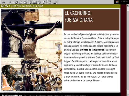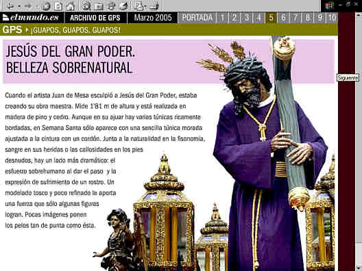 28 de Marzo de 2005 Palabrita del Niño Jesus de la Sacramental del Sagrario , que iba a colgar hoy en la web el cartel de "Cerrado por descanso y depre postcofradiera del personal" ( osea un servidor, es divertido me han llegado a preguntar estos dias que "cuantos eramos" en la "redaccion" de esta web ), pero claro uno tiene la mania de montarse en la barquita de la plaza de España ( que por cierto sigue mas seca que el ojo de Benito ) y se encuentra uno con cosas tan chirriante como estas . Un especial de el Diario El Mundo, bajo el acertadisimo titulo Guapos, Guaspos y Guapos .- Aclaracion importante en "esto" no tiene nada que ver Juan Miguel Vega, ni Francisco Robles que escribe en dicho diario y seria curioso ver si San Malaquias o el señor Robles hacen un ejercicio de auto-critica a este trabajito que no tiene desperdicio :
