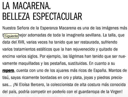 Este es el texto que le dedican a la Esperanza Macarena , en que milagrosamente si han acertado y si es la Macarena. Si lo leen uno piensa por un instante que se estan refiriendo a una top model fassion, que una Venerada Imagen cuya devocion sobrepasa nuestra fronteras , parece mas un anuncio de Corporacion Dermoestetica .- Rectificar no es de sabios, sino de los que meten la pata hasta la señalita de la vacuna y confiemos, esperemos, anhelamos que " nuestros compañeros " ( como le encanta decir a cierta pagina web ¿ escribiran algo sobre esto ?) ; desde el Diario el Mundo, hagan un profundo, examen de conciencia, dolor de corazon, confiense este pecado y como penitencia pidan disculpas al respetable en general y a las hermandades que les da de lleno este desaguisado y espero ver hasta donde llega el grado de critica mordaz del amigo San Malaquias y del señor Robles , aunque por otro lado seria humanamente comprensible , que no dijeran esta boca es mia .- A quien corresponda, que le pegen un buen tiron de orejas a los innumerables autores de este "especial" y ya que seguro que cobran por esto que por lo menos se molesten en hacer bien sus deberes y hoy por hoy sentado desde sus despacho basta saber , manejar un ordenador y el interné, para hacerlo medio bien,( hasta mis hijas hacen los deberes , navegandoi por la red , mejor que esto ) amen de una minima consideracion y respeto hasta las imagenes por lo que son y representa para varios cientos de miles de persona, que quizas al verlo , le haya hecho de todo menos la gracia que de una forma desacertadisisma se pretende buscar .- Alguien dijo una vez que : la arquitectura era algo tan serio que no s epodria dejar solo en manos de los arquitectos, pues con el periodismo , como vemos en este caso , se podria decir lo mismo . ¿Podra mas el compañerimo gregario o la critica a esta torpe ofensa y salta de errores mal hilvanados ?