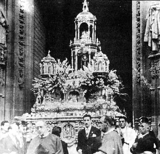 Aunque aun estamos en el camino de vuelta del Rocio, Triana aun no ha regresado a su casa , abró esta mini- cuaresma eucarística, contectando con la reciente y accidentada presentación del cartel del Corpus 2005 ( lo pueden ver pulsando CARTEL ( MUNICIPAL) CORPUS 2005,. Don Victor José Gonzalez Ramallo en su inagotable fuente documental gráfica nos trae hoy esta impresionante imagen que viene como aceite a la espinacas .- El pasado lunes se presentó el cartel del Corpus de este año que publica la Delegación de Fiestas Mayores del Ayuntamiento. Una fotografía de los años cuarenta del altar de plata de la Sacramental del Salvador en la fachada de la Casa Grande sirve de homenaje, no sé si involuntario, a esta histórica Hermandad fusionada desde 1918 con la de penitencia de Pasión. Para los que no se acuerden o lo desconociesen , aqui lo pueden VER .- De hecho, este altar es el que cobijaba al Señor de Pasión desde que se adaptó a fijo en 1957 hasta su reciente y obligado exilio de El Salvador. Enlazando con este recuerdo a la faceta eucarística de la Archicofradía de Pasión traemos hoy una insólita fotografía tomada a la salida de la Catedral el 26 de octubre de 1958. En ella vemos a las inconfundibles andas de plata del Señor de Pasión (con su correspondiente San Fernando en el frontal de sus respiraderos, sin escudo bético ) con unos faldones de damasco blanco portando a la Sagrada Forma cobijada en una custodia monumental. Esta custodia procesional es la que, basándose en la catedralicia de Arfe, realizó Andrés Ossorio en el siglo XVIII y que preside el Corpus Chico de Triana. VER Tiene una base octogonal con dos cuerpos el primero con el Viril y el superior con un precioso grupo en plata de la Virgen con Santa Ana. Analizada la fotografía, veamos el motivo de esta otoñal procesión eucarística. Se cumplían entonces las Bodas de Diamante de la fundación en 1883 en Sevilla de la Adoración Nocturna. La procesión recorrió los aledaños de la Catedral de forma similar a como se conmemoró posteriormente el Centenario de esta Institución Sacramental el 25 de junio de 1983. En esta ocasión fueron el paso y la Custodia de la Hermandad de San Bernardo los empleados.-CORPUS DE SAN BERNARDO