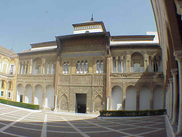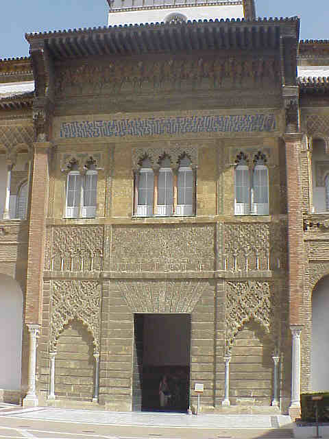 Entamos ya ante el Palacio Mudejar que constituye la parte mas importante de los Reales Alcazares. Se lo debemos al monarca Pedro I , contruido entre 1364 y 1366. Su espectacular fachada es un inmeso recital de estilo arquitectos, y donde se pude apreciar las diferentes manos que en el intervinieron , se meclan elementos arquitectonicos cristianos ( como el gótico ) con el almohade con un claro predominio de esta última.-