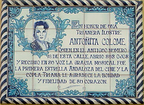 29 de Agosto de 2005Ayer fallecia la actriz sevillana Antonia Colomé Ruiz , que cosa rara, antes de fallecer ya contaba en su ciudad natal y barrio con este lienzo cerámico conmemorativo de resaltado su incuestionable labor artistica . -