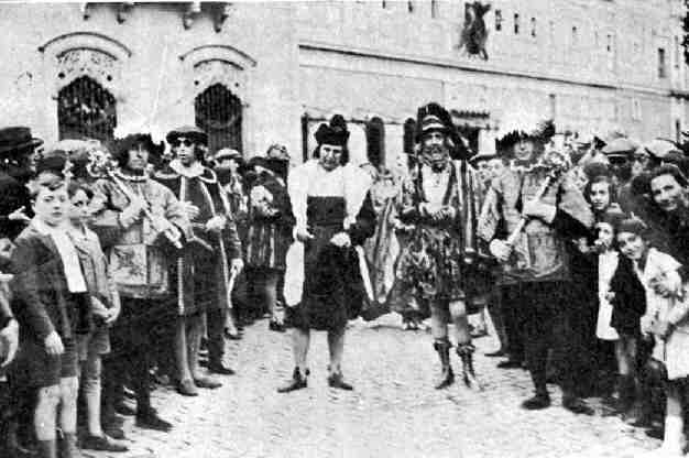 Continuando con imágenes de la Cabalgata Histórico-Mariana de la tarde del 20 de mayo de 1929, vemos hoy fotografías de los tres últimos cuadros. El cuadro superior estaba dedicado al segundo viaje de Colón al Nuevo Mundo (1493) en que el Almirante acompañado de su hermano Bartolomé, sus hijos Hernando y Diego junto con frailes, marinos y los caballeros veinticuatro se dirige a implorar el auxilio de la Virgen de la Antigua para iniciar la Evangelización. No se pierdan el segundo figurante a la derecha de la imagen , con unas inadecuadas gafas de sol Este cuadro fue organizado por las Condesas de Ibarra y Bustillo en nombre de la Congregación de las Irlandesas. La fotografía está tomada unos metros por delante de la de San Fernando, pues se aprecia la esquina del palacio de Palomares, entonces Almacenes del Duque Entre el cuartel de Artillería del que vemos la puerta con visera y este palacio sobre el que se edificaría El Corte Inglés existía una tortuosa vía conocida como Callejón de Los Estudiantes que comunicaba con la calle Alfonso XII y del que adivinamos su entrada.