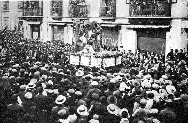 La Cabalgata estaba concebida en seis cuadros que querían representar mediante carrozas y personajes a pie y a caballo otros tantos momentos históricos relacionados con la devoción sevillana a la Virgen. Las fotos de hoy corresponden al primer cuadro dedicado al siglo III y en el que una carroza a modo de cárcel se ve a Santas Justa y Rufina. Las alfareras trianeras están deseosas de despedirse de la imagen de la Virgen a la que rezaban en su taller y son custodiadas por el Pretor Romano Diogeniano que las sigue en un rico palanquín y por el lictor Sabino que se convertiría al cristianismo. En primer término vemos a una especie de “armao” que no sabemos si va como representante de la tropa a pie que custodiaba la carroza de las mártires o como bueyero Este cuadro tuvo como director artístico al pintor Juan Miguel Sánchez bajo la supervisión general del arquitecto Aníbal González que había fallecido días antes. En la primera fotografía podemos comprobar el inmenso gentío que se agolpaba a lo largo del recorrido de la cabalgata. La toma corresponde a la plaza del Duque esquina a La Campana delante del edificio de la Kodak. Las crónicas de la época hablan de “una inmensa muchedumbre atónita... con un respeto tan asombroso que parecía estar en el interior recogido de un templo”.