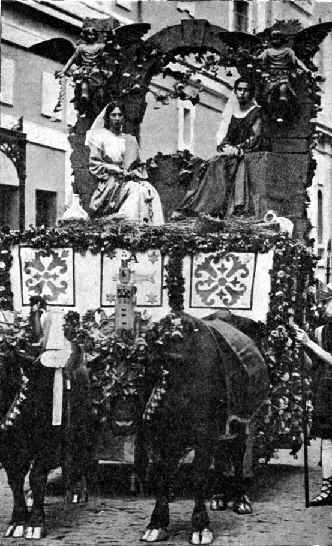 Espero que la fotografía que encabeza estas líneas suscitará la curiosidad de más de uno y continúe leyéndonos hasta averiguar las circunstancias que la motivaron. Son nuestras Santas Patronas,( y de la localidad valenciana de Manises , por aquello de la cerámica ) Santas Justa y Rufina, encarnadas por dos gentiles señoritas de la Sevilla de nuestros abuelos y subidas en una carroza que representa la cárcel en la que esperaron el martirio. La ocasión que justificó esta insólita estampa, que algunos pueden considerar hasta irreverente, fue la organización de una Cabalgata Histórico-Mariana dentro de los Actos del Congreso Mariano Hispano-Americano celebrado a la sombra de la Exposición Iberoamericana. A las seis de la tarde del