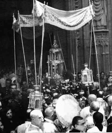 Asi, asi, con la Custodia Chica, ( la Grande de Arfe, la tiene envuelta en plástico , como un bocadillo de mortadela del güena, con aceitunas ) bajo palio y a la que solo asistieron doce concejales , que seguro que serian los del PP de la época .- Esto de la recuperación de la memoria