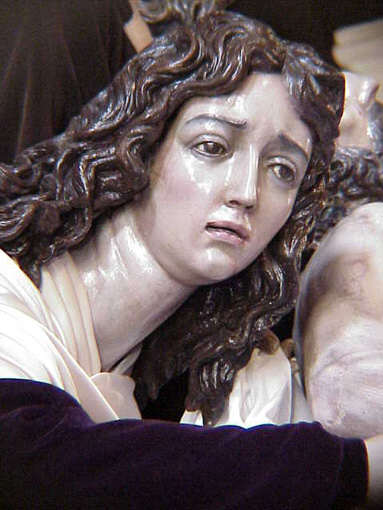 En nuestra Semana Santa , tiene muchismo trabajo , yo me atreveria a decir que la que mas . Se representa casi siempre desmelenada ( con pelo natural o talla ), puede aparecer con la coronita simbolo de santidad o no y aparece o en solitario ( Monserrat y la Hiniesta ) o junto a las otras dos Marias ( Maria Salome madre de Judas Tadeo - el Judas Bueno- y Maria de Cleofas madre de Santiago el Menor ). Solo en el paso de la Hiniesta va solo con el Crucificado, mienstras que en los demas caso va en paso de Misterio .-