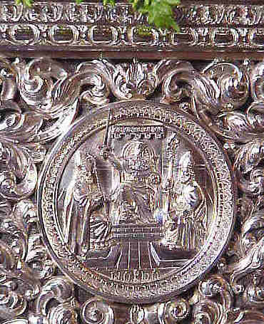 A continuación , tenemos unos bellos basamentos de plata de unos candelabros de cola donde esta representado a los "maceros" ( por aquello de la ciudad - versus ayuntameinto-) bajo mazas ), donde se puede ver el escudo de Sevilla a los pies de la figura de la izquierda segun se mira .-