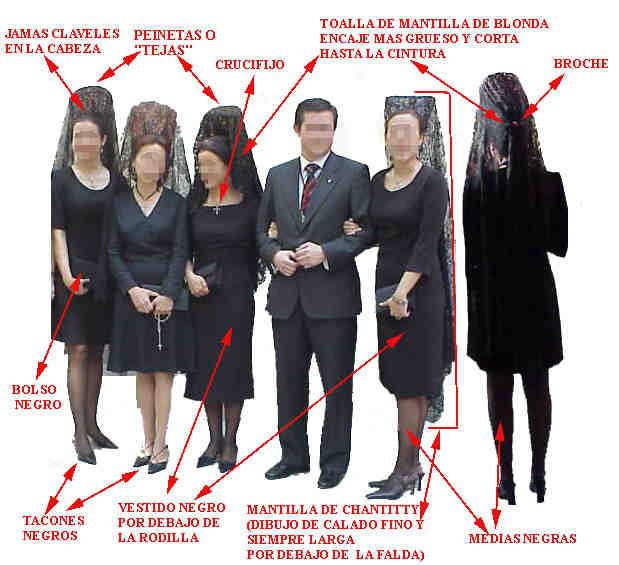 Veran mujeres vestidas de mantilla SOLO el Jueves y el Viernes Santo.,( tranquilos , no son monjas, no pertenecen a ninguna secta , con se ha oido en algunas desafortundas ocasiones ) Se usa para visitar los templos por la mañana y los Sagrarios y ver las Procesiones por la tarde y noche solo de esos dias . Se va vestida de luto, por lo que es "pecado mortal", llevar claveles o ningun otro tipo de flor en la cabeza , usar minifaldas o gafas de sol .-