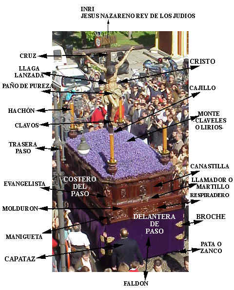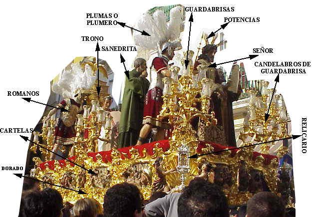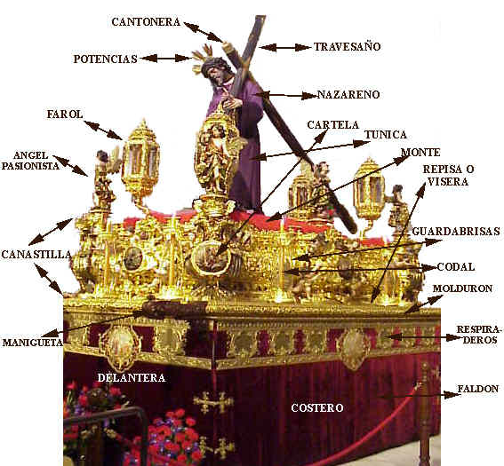 Todos los pasos tiene una estructura o armazon llamado parihuela , QUE NO SE VE . En su parte superior estan palos situados paralelamanete llamados trabajaderas es donde con el cuello portan los costaleros los pasos .-