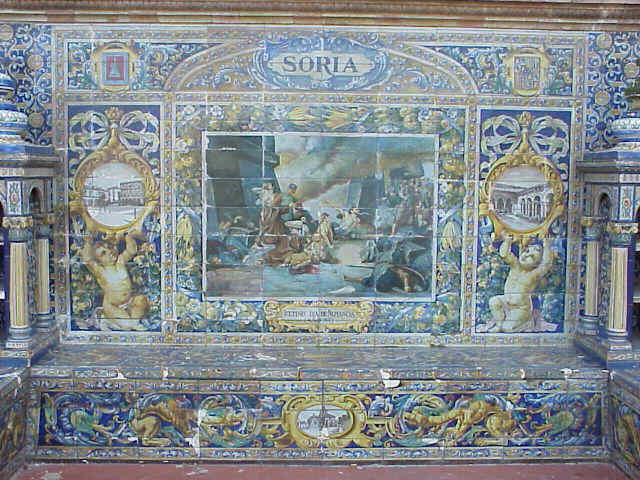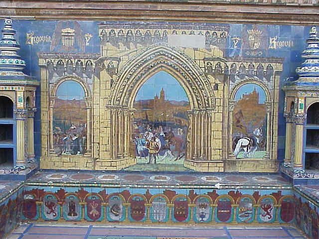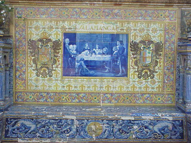 ![]() En enero de 1475 se firma la Concordia de Segovia entre Isabel y Fernando donde se produce un reparto de competencias entre ambos monarcas. Isabel es "reina y propietaria de Castilla" y su esposo recibe el título de rey Curiosamente este azulejo es el unico cuyo nombre de la provincia aparece por dos veces y no en el centro del mismo como ocurre en los demas .-