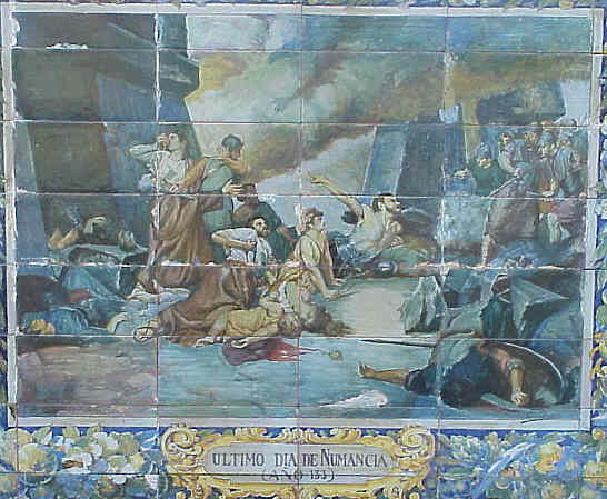 Año 133 AC El asedio de la ciudad celtibérica de Numancia se prolongó por un amplio espacio de tiempo.La proporción entre asediantes y asediados, era cláramente desfavorable para los numantinos. Se calcula que el ejército romano alcanzaría los 25.000 hombres, mientras la población asediada se calcula en unos 8.000-10.000 hombres. Después de sitiar Numancia durante ocho meses, la ciudad se rinde agotada por el hambre y las dificultades. Algunos de los habitantes de Numancia prefirieron darse muerte entre sí, antes que rendirse a los romanos.