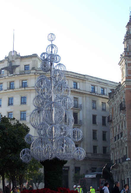 26 de Diciembre de 2006 Eso que ven ahi arriba, lo han colocado frente a nuestra Nueva Plaza Fea y no es un exposición de armas phaser de la nave Enterprise o una torre de comunicaciones de la Voyager , de la saga Star Trek. Tambien podria ser un homenaje a los bombos de la loteria de Navidad o una evocación a todo lo alambrada que esta Sevilla que por cierto el poético azulejo de la Puerta Jerez :lo deberian ampliar : HERCULES ME EDIFICO