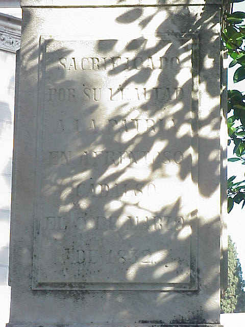 El problema es que sus verdugos para humillarlo lo ajusticiaron en plaza publica concreatemnte en la Plaza de San Francisco( mas pública imposible ) y en el cadalso, como un delicuente comun, cuando dada su condición de militar deberian de haberlo ejecutado ante un pelotón de fusilamiento . Como reza en la placa lo llevaron al cadalso el 9 de Marzo de 1832 .-
