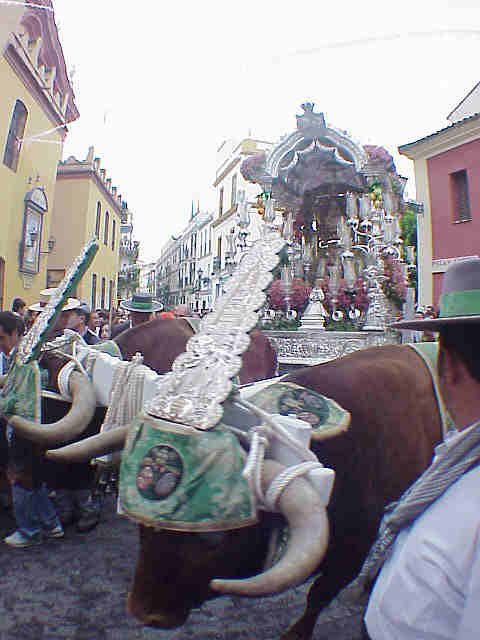 En los finales de MAYO el Rocio y las Hermandades de Gloria Rociera, estaban de suerte, regresaban los bueyes de la misma forma misteriorsa que el año anterior habia sido sustituidos por mulos . Con ellos regresaron las Carretas del Simpecado de plata y su nubes de peregrinos a paso lento por caminos y veredas alfombradas de arena . Un año donde la Virgen del Rocio regreso de Almonte al Rocio, pocos dias antes de la Romeria VER