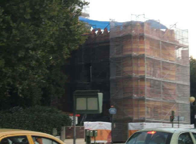 La Plaza de España, nuestro "Museo Ceramico al Aire Libre", en un proceso de mas que urgente y necesaria restauración actualmente interrumpida,¿ definitivamente ? llena de vallas con xerigrafias de "esto lo estamos arreglando", pero lo dramaticamente cierto, es que alli no hay nadie y solo han dejado , el trabajo a medio hacer y los restos de materiales .-
