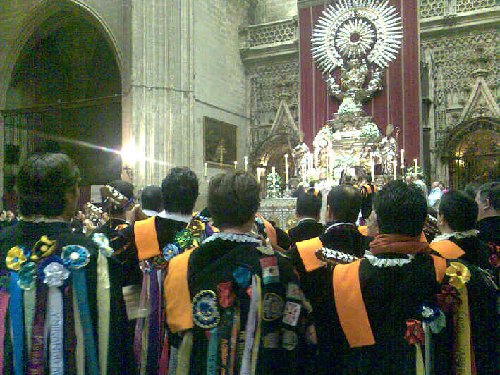 Efectivamente la Catedral de Sevilla acogió el pasado jueves la tradicional Vigilia de la Inmaculada, presidida por la Pura y Limpia del Postigo .situada en el altar que preside la Nave del Crucero.