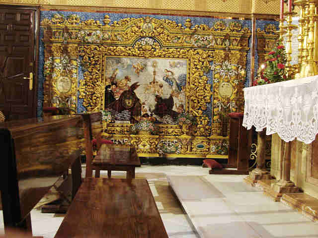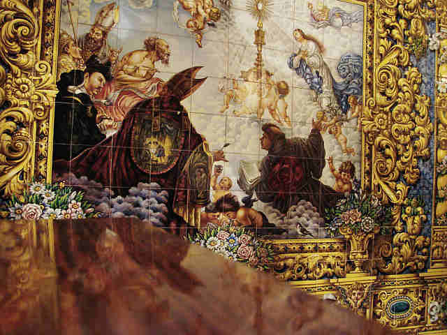 5 de Junio de 2007En la Capilla Sacramental de la Parroquia de San Benito que esta decorada en su zócalo con lienzos cerámicos como el que aqui ven obra de Juan Oliver Miguez . Fijense bien en esta impresionante Exaltación de la Eucaristia y preguntense si les suena .-