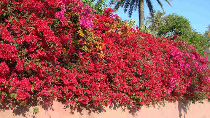 8 de Abril de 2007 Mayo es el mes de Maria y el mes de las flores . Frente a gitanillas, geranios, jacarandas, , la buganvilla que aqui ven tiene una enorme virtud sobre todas las demas , la resistencia .- Este impresionante muro donde esta hermosa flor aparece en todas sus tonalidades , es de la admiración de propios ( las menos ) y sobre todo extraños, puesta basta ver como desenfunda las camaras para fotografiarlos desde los coches de punto cuando pasan ante él, en estos dias de su máximo florecimiento .- Por si alguno no lo ha pillado o van con demasiada prisa en su coche ( sin saber muy bien a donde va ), este auténtico monumento de la flora sevillana esta en lo que queda del Palacio de San Telmo , impunemente arrasado y que hoy lo que usted ve desde la calle es solo un decorado de lo que fue .- Posiblemente hoy, Maria de las Mercedes si se marcharia de Sevilla , al ver lo que han hecho con la que fue su casa . Curiosamente en el llamado Costurero de la Reina, ( que va por su enesima rehabilitacion ), nuestra cantada Maria de las Mercedes no le dio tiempo a dar una sola puntada, pues ya estaba muerta , antes de que lo construyera , pero posiblemente si veria esta buganvilla cada Primavera cuando paseaba a caballo y tonteaba con Alfonso XII .- Este increible muro de belleza ha sobrevivido , al paso de camiones, al polvo de cemento, yeso y cal de esas demoledoras obras a las que esta sometido no solo el Palacio sino de los que queda de sus jardines y ha florecido un año mas en todo su esplendor y si les soy sincero me da hasta miedo decirlo pues cualquier dia la arrancan, como aquella gigantesca y archifotografiada buganvilla que envolvia en una fresca sombra a modo de tunel florecido el callejón del Agua del barrio de Santa Cruz he hizo falta un ejercito de hombres y camiones ( hasta diecisiete ) para arrancarla y dejar unos desnudos muros , con un Sol impio en Primavera y Verano , solo Dios sabe en nombre de que .- A Sevilla la estan desfigurando, de hecho la han desfigurado ya de forma practicamente irreparable y lo peor de todo de una forma arbitraria, chapusera y terriblemente costosa ; sencillamente da pena ver como en tan poco tiempo la incompetencia y el mal gusto , puede destrozar el buen gusto y el equilibrio , de años y de siglos .- Por desgracia, que no por suerte, aun quedan solo retazos de lo que fuimos , como este cartel de Primavera viviente y en su contemplación tiene uno que hacer un ejercicio de inmesa imaginación para reconstruir nuestra ciudad virtualmente en nuestras mentes ; pues esta buganvilla nos envia un mensaje y una lección de resistencia, ante la cantidad de tonterias que brotan como un manatial de lo que tenemos metido en "Plaza Nueva" y desesperanzadoramente de los que se pretenden meter .- Sólo dos cosas son infinitas, el universo y la estupidez humana... y no estoy seguro de lo primero.- Albert Einstein.