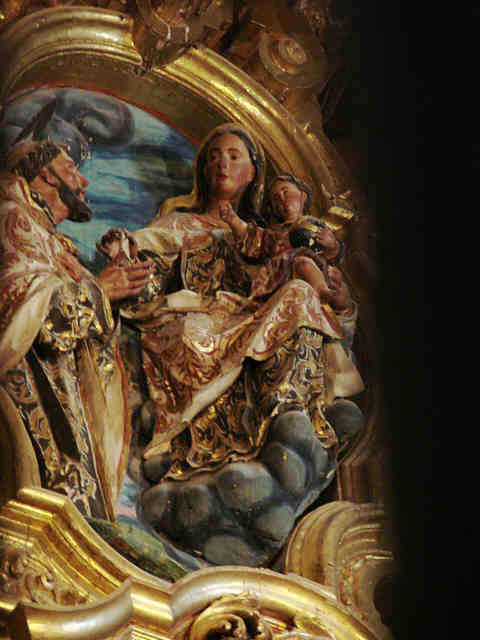 11 de Junio de 2007 Por aquello que estos dias esta uno a cuenta de la vidrieras, dando mas vuelta que Marco buscando a su madre, por nuestra Catedral y como uno mira mas que un borrico atao a una tapia , miren ustedes con lo que me he encontrado en el ático de un retablo catedralicio .- No deja de ser curioso que en un inmeso monumento como la Catedral hispalense, no solo por su continente, sino por su inmeso contenido , donde hay todo un abanico de advocaciones a Santos, Martines, Cristos y Virgenes, en muchos casos repetidos , precisamente una Virgen con tanta raigambre como la Virgen del Carmen ,( practicamente en casi toda las iglesias y parroquias de nuestra ciudad haya una representación de la misma ) cuya festividad celebraremos dentro de unos dias solo haya una y este en un lugar poco accesible a la vista .- Se encuentra en la parte superior del retablo de la capilla de San Hermenegildo, donde se ve a esta bella Virgen del Carmen, con el Niño entregando el escapulario a San Simeón Retablo magnífico obra de Manuel Garcia de Santiago fechable en el siglo XVIII .- Cuestión de figarse .-