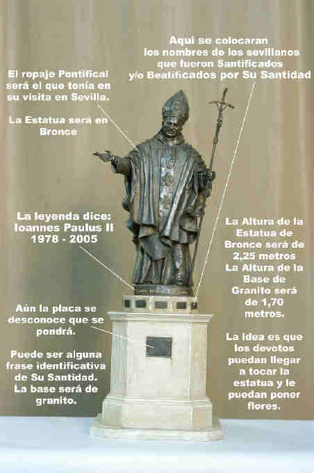 12 de Abril de 2007 No se quejaran los escultores residentes en Sevilla, pues la producción escultórica no solo semanasantera sino urbana es de las mal altas de España, aqui no hay mes que no se proyecte , se construya o se inaugure , alguna estatuas a alguien, venga o no a cuento .- Ahora le ha tocado el turno al por ahora Papa Juan Pablo II y dentro de muy poco Santo , y donde habrá que demostrar eso de !! Juan Pablo II te quiere todo el mundo !! ,si se lo gritaban de verdad el personal de verdad cada vez que venia a Sevilla o lo decian con la boquita chica , pues su financiación será por cuestación popular y en menudo compromiso de aflojamiento de cartera van a poner a las hermandades pontificias y todas aquellas que entre su juego de insignias tienen , el escudo del penultimo pontifice .-