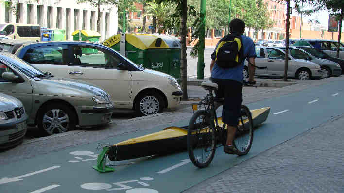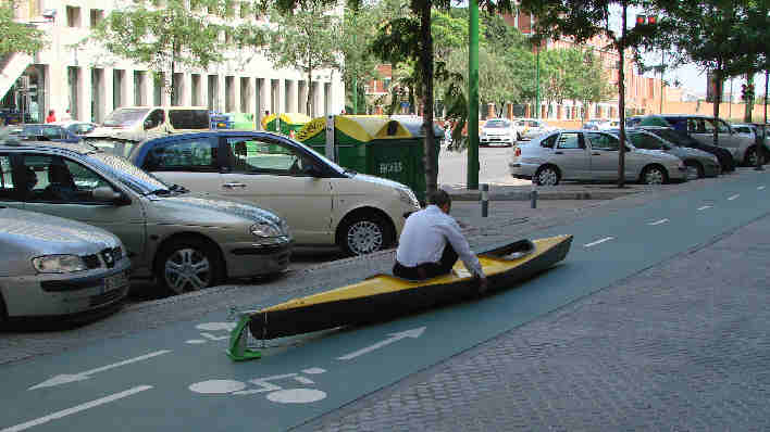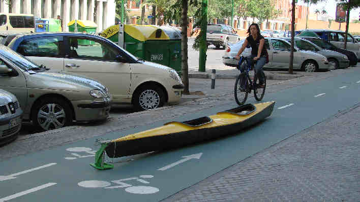 Esta mañaNA amanecÍa en la Av de la Buhaira esquina a Luis Montoto esta piragua biplaza , k2 kayak de piraguismo, suponemoS que reivindicando un necesario carril acuÁtico a falta de ria de la Plaza de España que esta mas seca que el ojo Benito .- No solo se puede navegar por internet, se puede navegar por Sevilla, Sevilla es una ciudad navegable ( ¿ no van a montaR un telesferico ? ), usted puede ir como en Venecia al trabajo, llevaR los niños al colegio , ir al Carrefu, ancaercorteingle, solo es cuestión que los obreros españoles con sus socios de gobierno decidan anexionar a los ruidosos carriles bicis , de timbres , de prepotentes gritos de: "! Apartensen, Apartesen !", el silencio de unos remos.- Oiga ya lo estoy viendo una empresa que alquile patinetes y canoas por horas .-