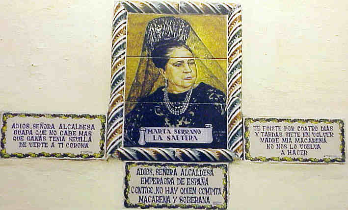 11 de Marzo de 2007En la calle Parra ( que cosa mas rara ) están estos azulejos que nos hablan de Marta Serrano, la Saetera , donde vivia y donde siempre se paraba la Macarena a escuchar su saeta , hasta que un dia la Madre de Dios la llamó a su presencia y se traslado para contemplarla a Ella, al jazmín de la Basílica en forma de cenizas ( en aquello arriates hay algunos mas ) .-
