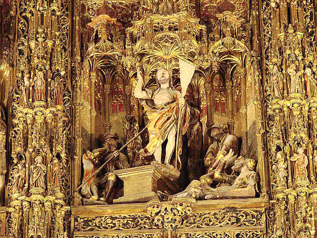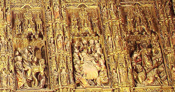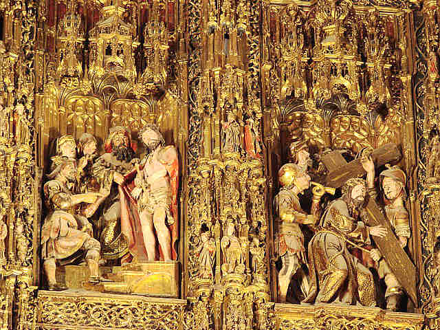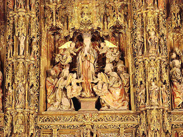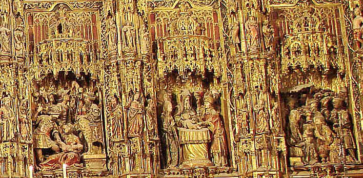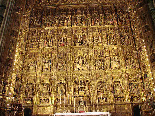 27 de Noviembre de 2007Antes de que usted se vaya al puente de la Concepcionista Constitución o la Constitución Inmaculada ; aqui ven el Retablo Mayor, de la Catedral de Sevilla el mas grande de la Cristiandad. Es obra que se realizó en sucesivas fases a lo largo de casi un siglo, comenzándose con trazas del escultor flamenco Pyeter Dancart, quien en 1482 consiguió un retablo de veinte metros de alto por dieciocho de ancho, con cuatro cuerpos de altura mas un banco, en horizontal y siete calles.-