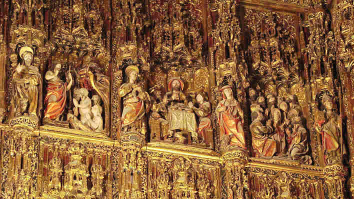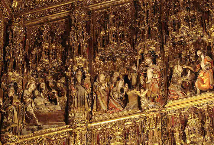 El retablo posee un conjunto de cuarenta y cuatro relieves y mas de doscientas figuras de santos que se disponen en las pilastras que articulan el retablo.