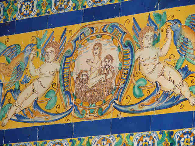 Mucho mas interesante es la decoración del zócalo de azulejeria trianera , con azulejos que versan sobre la dedicación de la capilla y donde se ven estos detalles monocrómaticos de las Almas entre las llamas, que con el frío que hay en San Lorenzo no esta del todo mal .-