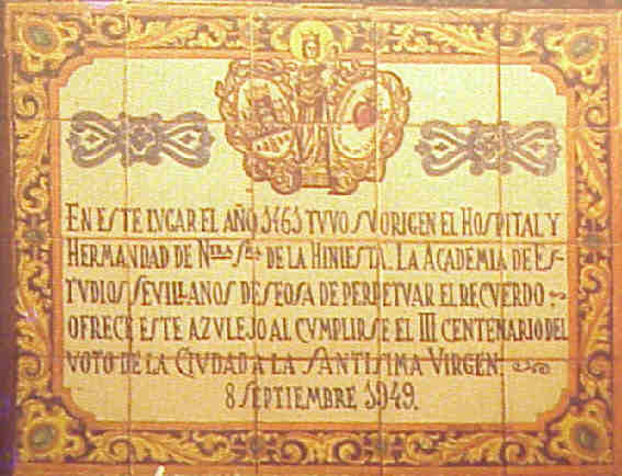 Lo que reza en este azulejo es mas o menos asi, porque veran el hospital se fundó en la calle Rascaviejas ( hoy Hiniesta) algo mas tarde en 1480 . La hermandad en 1560 y efectivamente en 1649 fue el famoso año de la epidemia por un lado , que sencillamente diezmó la población sevillana y la literal desaparición de los miembros de esta cofradia y por otro el voto municipal., que calló en desuso con el paso del tiempo , revovandose continuadamente a partir de 1941 .- La actual Hermandad de la Hiniesta tiene sus origenes